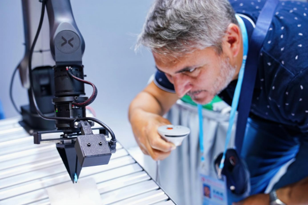展会上,视源股份机器人系列产品集体亮相,成为海内外客商关注的焦点。MAXHUB A3 智能柔性机械臂以“高速轻量、即插即用”为亮点,自重低于6kg,运动速度超过5m/s,重复定位精度达±0.1mm,支持多种开发语言与VR遥操作,已在工业分拣、职业教育等领域实现应用落地。