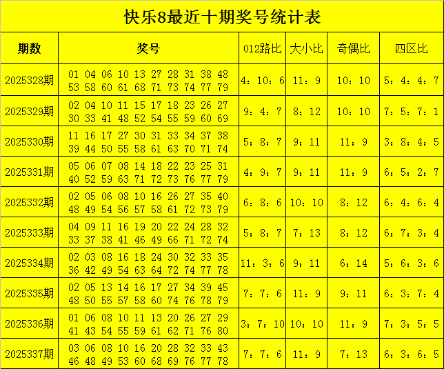 福彩快乐8第2025337期开奖回顾:03 06 08 10 16 20 28 32 33 43 46 48 49 53 60 68 69 76 77 78,其中奖号012路比为7:7:6,和值为823,跨度为75,奇偶比为7:13。