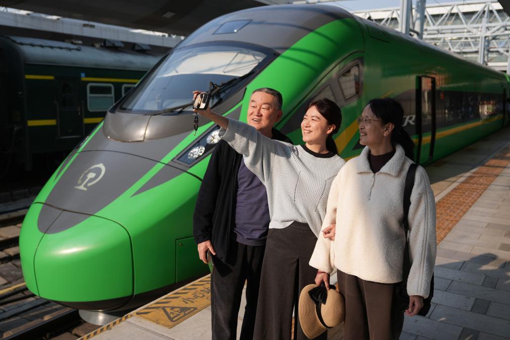 旅客在中老铁路列车前自拍留念。新华社记者陈新波 摄