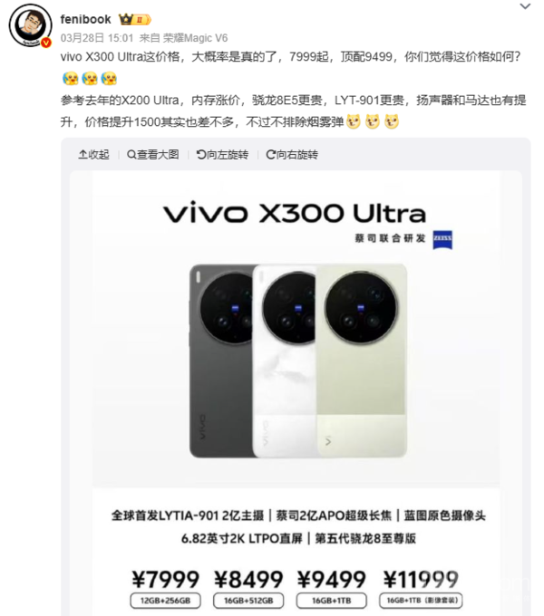 此前,部分博主对vivo X300 Ultra的起售价进行了猜测,普遍认为其起售价为7499元或7999元。其中,推测起售价为7999元的博主表示,内存价格上涨、第五代骁龙8至尊版移动平台成本提升、索尼LYT-901图像传感器的价格更贵,再加上扬声器与马达的配置升级,使得vivo X300 Ultra起售价较前代提升1500元具备合理性。具体预测售价为:12GB+256GB版本7999元、16GB+512GB版本8499元、16GB+1TB版本9499元,16GB+1TB版本(影像套装)11999元。